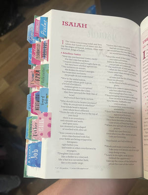 Organize your Bible with 105 laminated tabs and 80 faith stickers. Designed for quick navigation, elegant style, and effortless application.